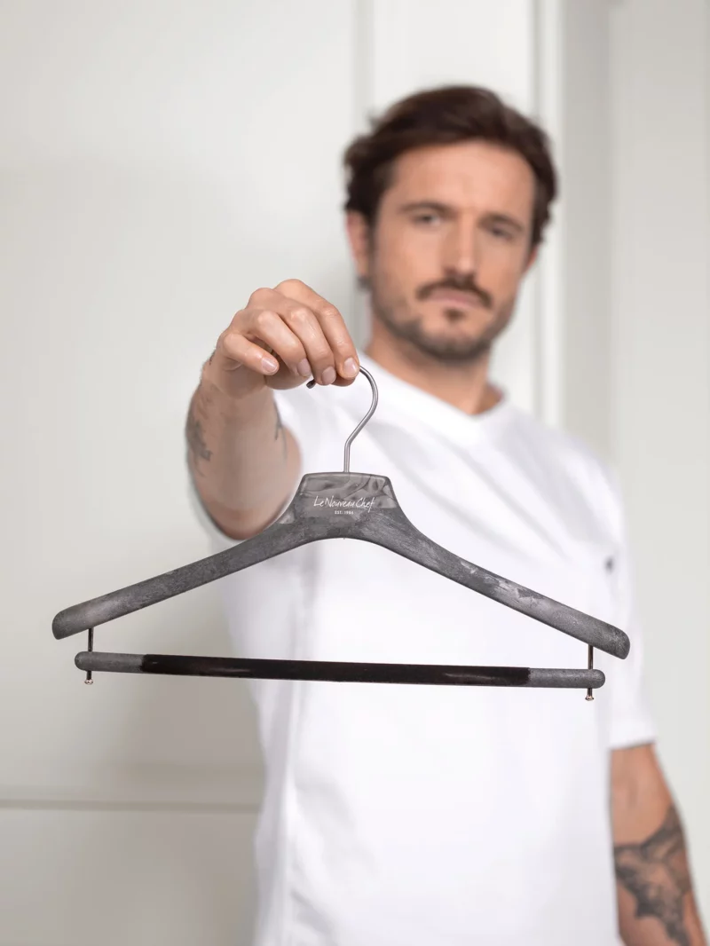 Breite Ausführung aus Polystyrol mit Metallhaken und Hosensteg mit Filz. Speziell zum Aufhängen von (Koch-)Hosen.