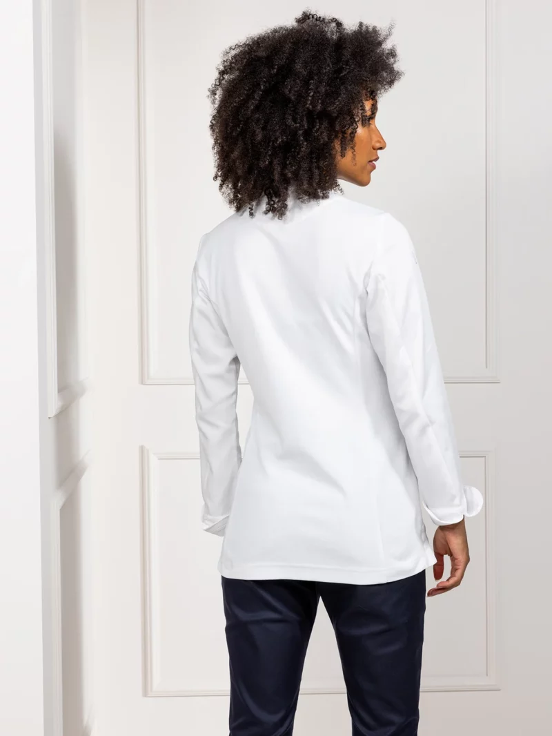 Kochjacke Elise ist eine elegant geschnittene Damen Kochjacke mit perfekter Passform. Dank der Verwendung von dehnbarem Polo-Piqué-Material für den Rücken und dem nachhaltigen Tencel für die Vorderseite ist diese Damenjacke das innovativste Modell auf dem Markt. Aufgrund der Verwendung von haltbarem Tencel hat es ein „Green Choice“ Label. Tencel ist ein Stoff, der eine kühlende Funktion hat und 50% mehr Schweiß absorbiert als Baumwolle. Da sich der Stoff auf der Haut sehr weich anfühlt, erhöht sich der Tragekomfort weiter.