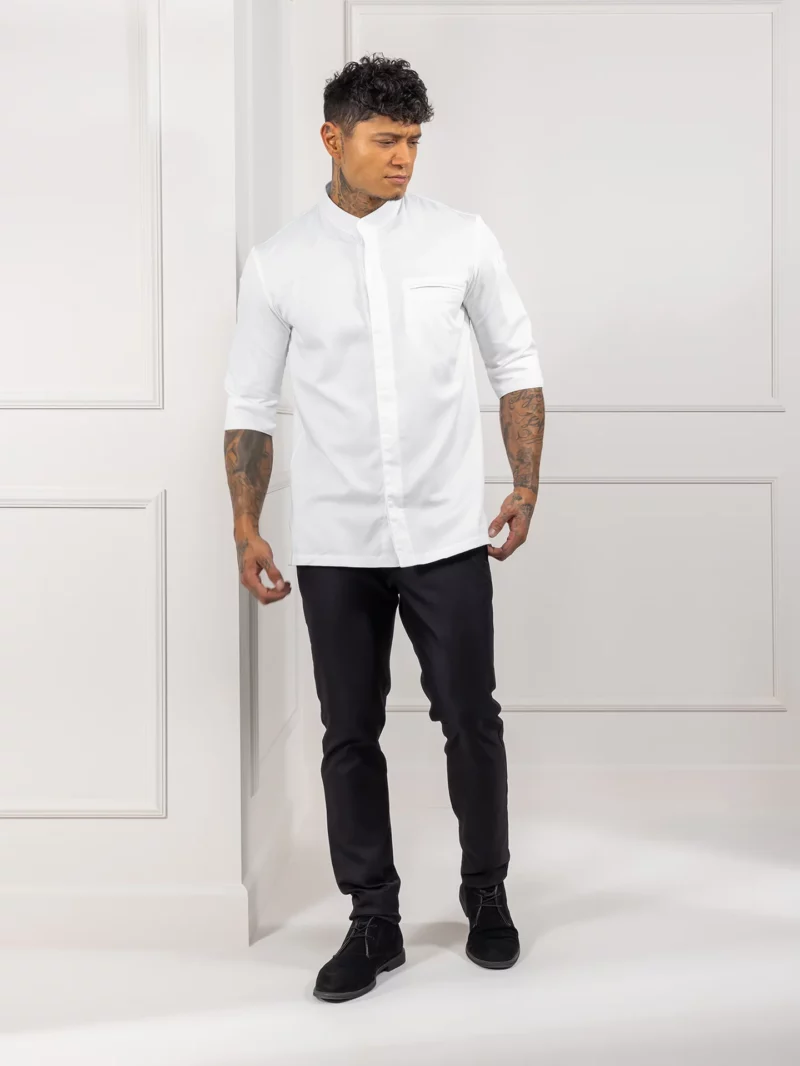 Kochjacke Fabian ist eine luxuriöse Kochjacke mit schlankem Schnitt. Diese Kochjacke besteht aus Polo-Piqué-Stoff, kombiniert mit dem innovativen Stoff Tencel. Tencel ist ein natürlicher Stoff aus Eukalyptusholz und bietet eine nachhaltige und ökologisch verantwortliche Alternative zu Baumwolle. Tencel hält den Körper kühl und absorbiert 50% mehr Schweiß als Baumwolle. Der Tragekomfort wird weiter erhöht, da er sich auf der Haut sehr weich anfühlt und der Rücken aus Stretchmaterial besteht.