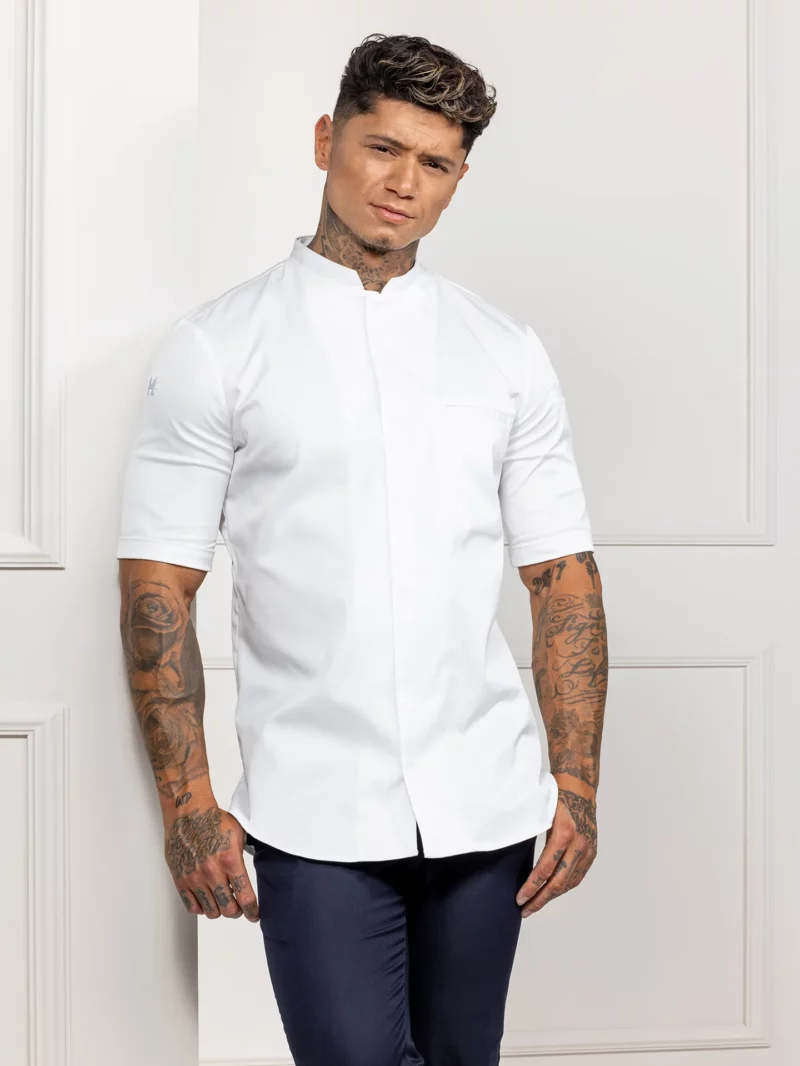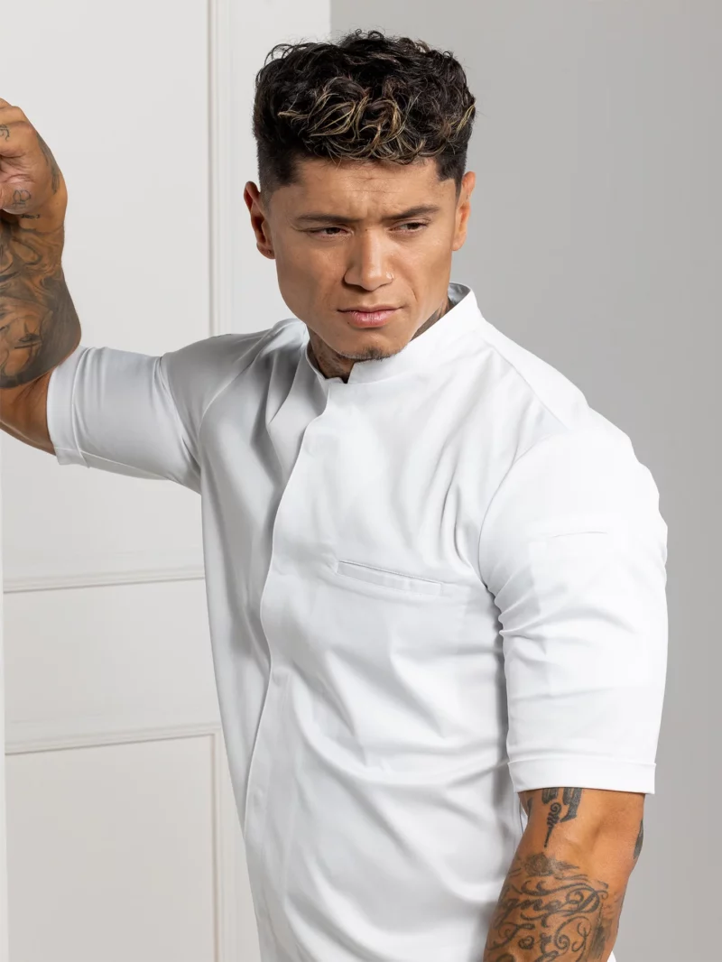 Kochjacke Tygo, diese Kochjacke mit luxuriösen umgeschlagenen kurzen Ärmeln ist aus maximalem (ökologischem) Stretch gefertigt und daher äußerst bequem. Als Besonderheit hat diese Jacke einen runden Schnitt mit kleinen Schlitzen an beiden Seiten und abgeflachten Druckknöpfen. Der verwendete Stoff hat ein weiches Finish, das sich nach dem Waschen in ein einzigartiges Stück verwandelt. Durch die Verwendung von fair gehandelter Bio-Baumwolle und recycelten PET-Flaschen trägt der Chefkoch ein Kleidungsstück.
